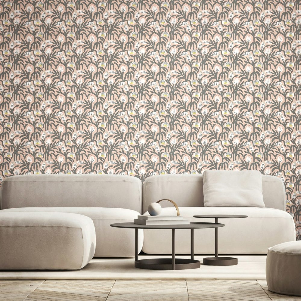 Abstract arching leaves and chunky flower heads combine with pops of colour to create a naïve and graphic interpretation of nature. Its joyful design is perfect to create a modem space in any interior.