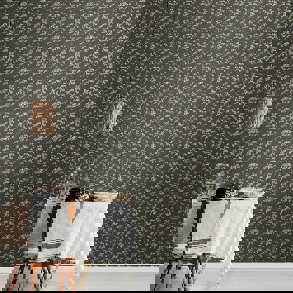 This elderflower-inspired pattern blends fine floral detail with a rhythmic stem motif that drifts seamlessly across the wall for a clean, contemporary look. Soft blooms hover over structured lines, creating a balance of organic lightness and geometric order, perfect for interiors that embrace natural simplicity.