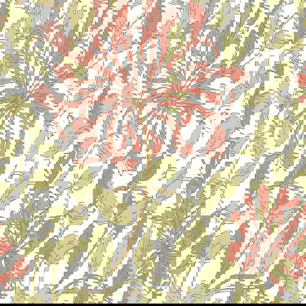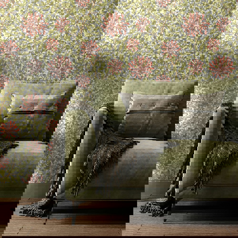 Realistic honeysuckle vines intertwine with leaves and weave across the wall. Inspired by the detailed illustration by May Morris this design pays homage to the arts and craft design era.