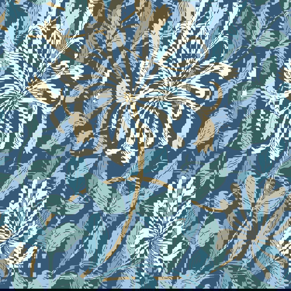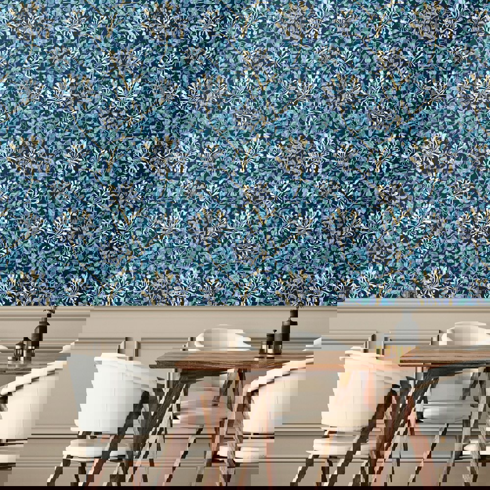 Realistic honeysuckle vines intertwine with leaves and weave across the wall. Inspired by the detailed illustration by May Morris this design pays homage to the arts and craft design era.