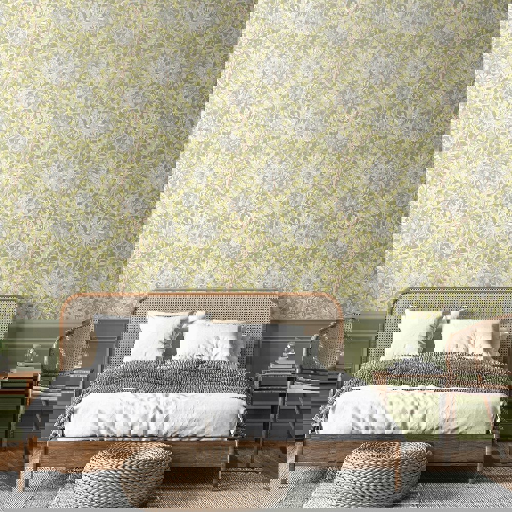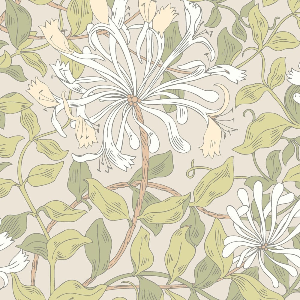 Realistic honeysuckle vines intertwine with leaves and weave across the wall. Inspired by the detailed illustration by May Morris this design pays homage to the arts and craft design era.