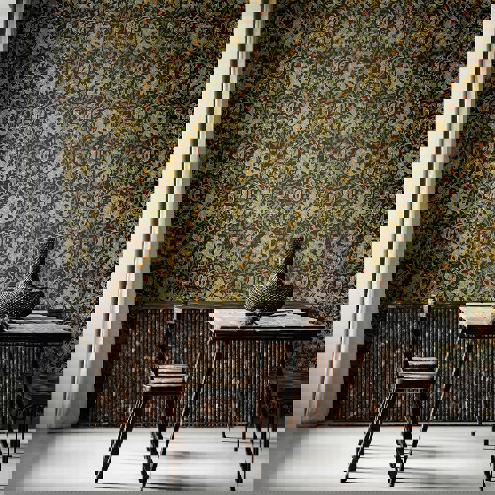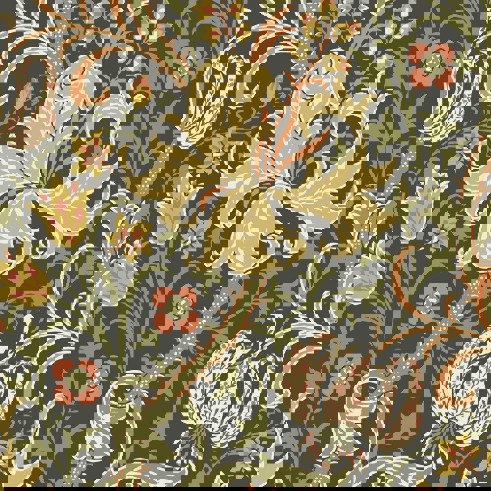 Stylised large lily flower heads and foliage tendrils wind around a subtle ogee trail. Inspired by John Dearle’s design for William Morris this interpretation is bold and confident.