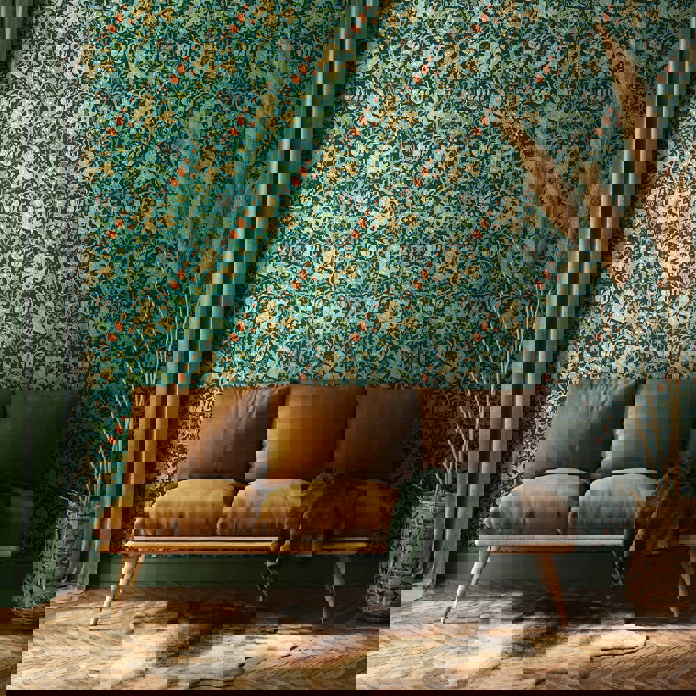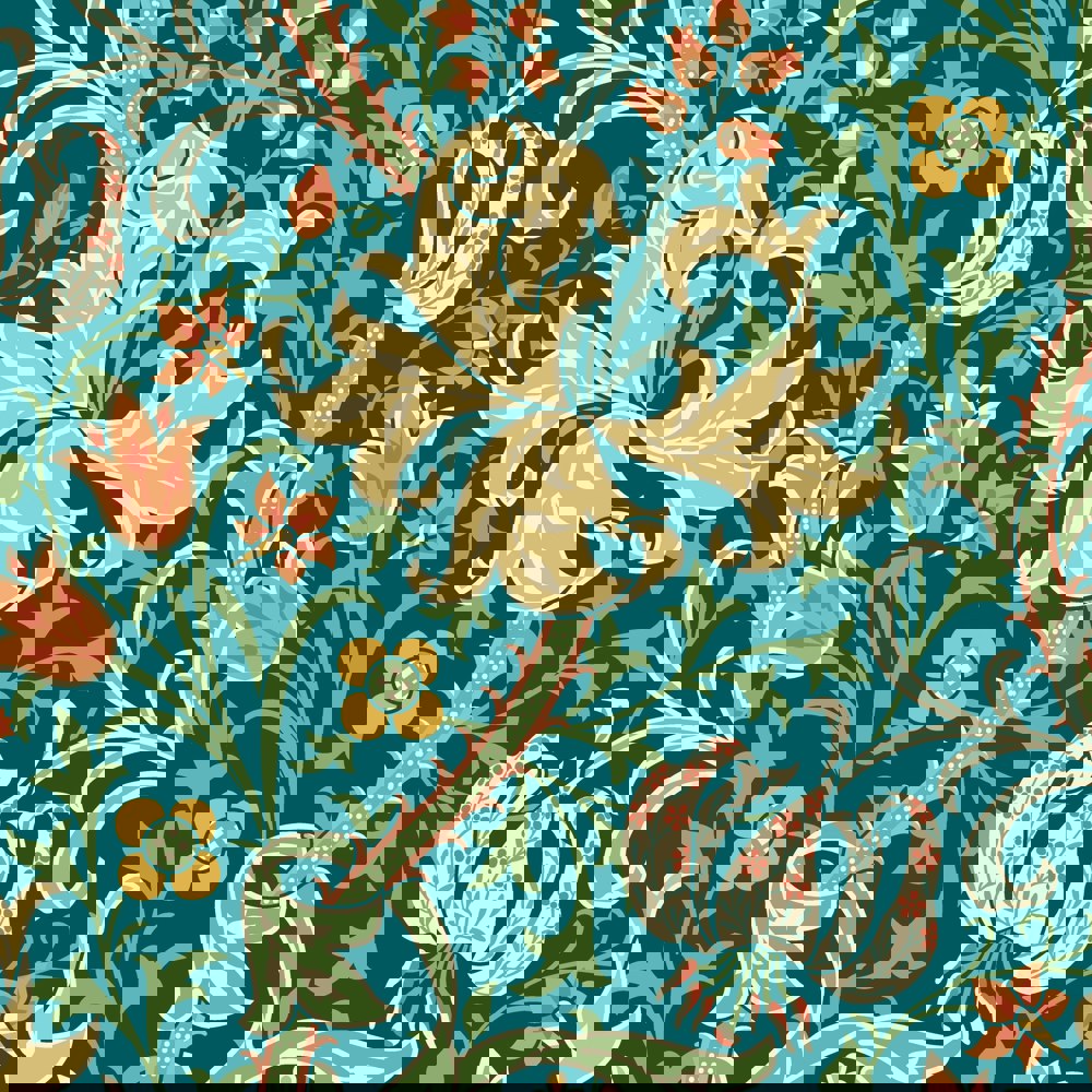 Stylised large lily flower heads and foliage tendrils wind around a subtle ogee trail. Inspired by John Dearle’s design for William Morris this interpretation is bold and confident.