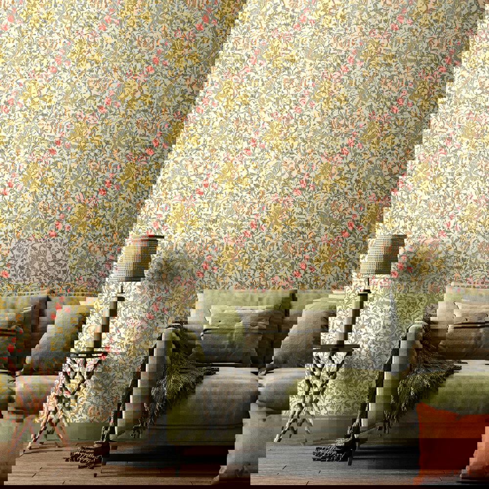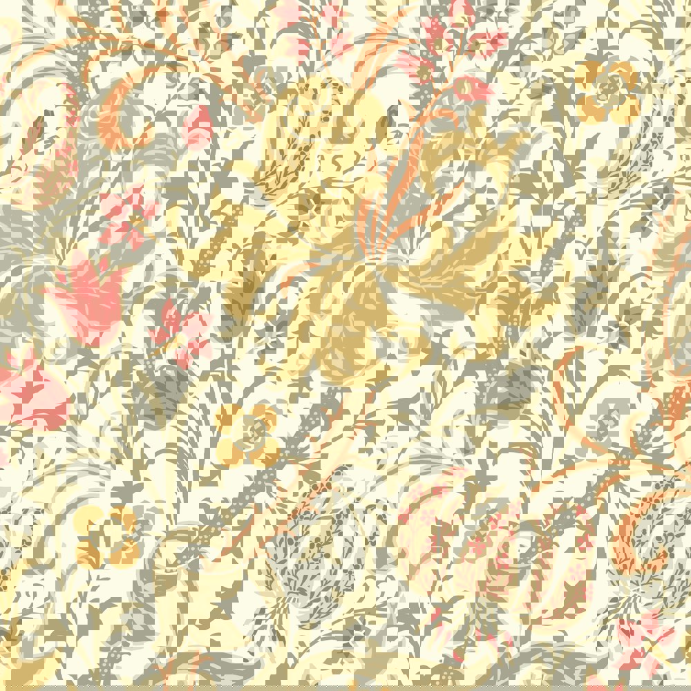 Stylised large lily flower heads and foliage tendrils wind around a subtle ogee trail. Inspired by John Dearle’s design for William Morris this interpretation is bold and confident.