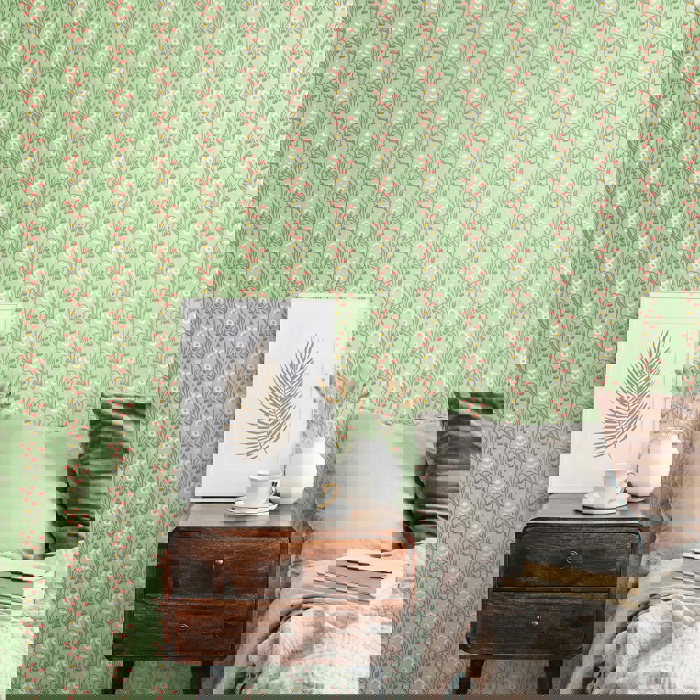 Elevate your interior with this linocut small-scale wallpaper. With modern, clean shapes formed by lino printing the design is distinctive with flower droplets and leaves creating upstanding stripes that span across the wall.
