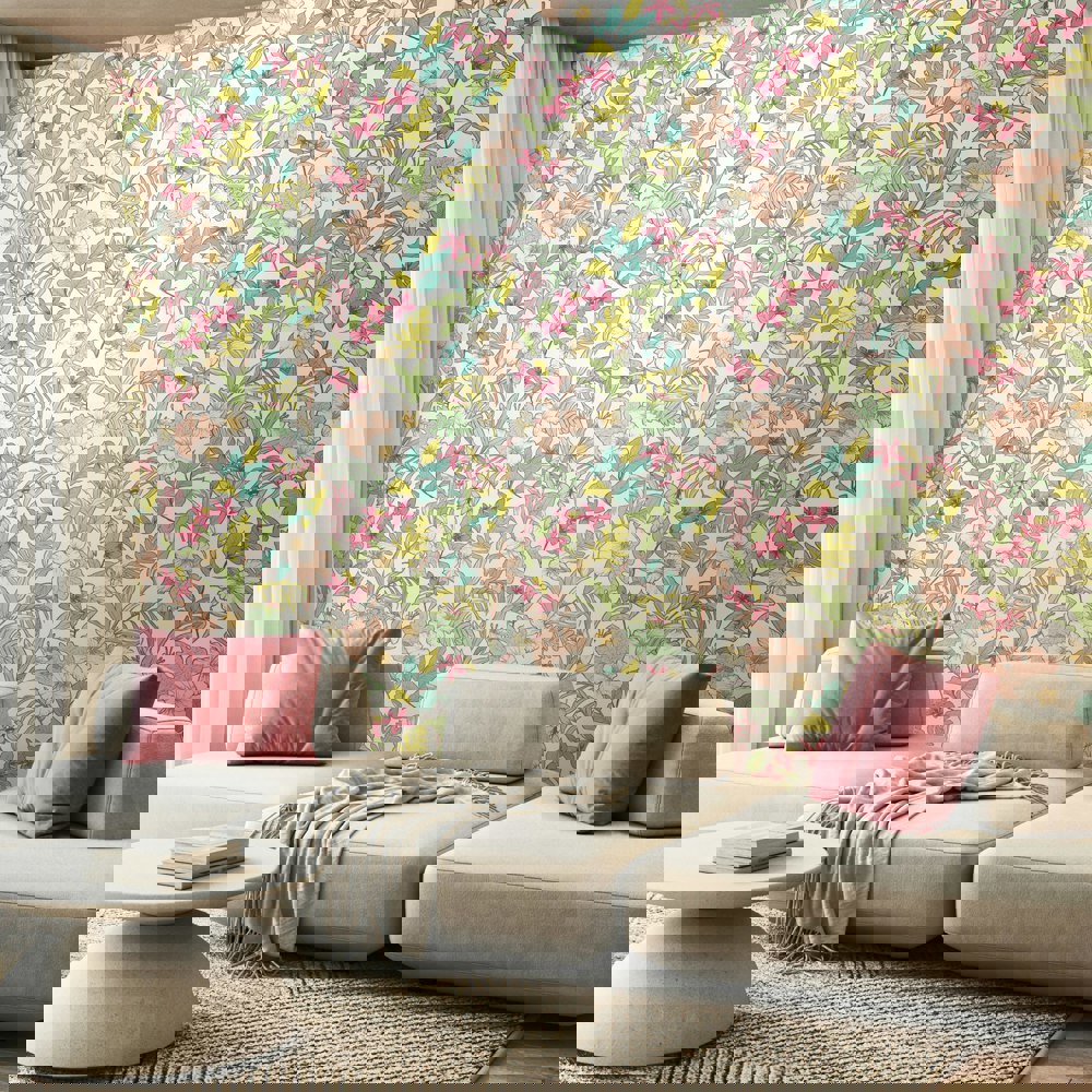 Oasis captures the spirited essence of an exotic paradise with an abundance of lush green leaves and colourful floral illustrations, bringing new life to your space.