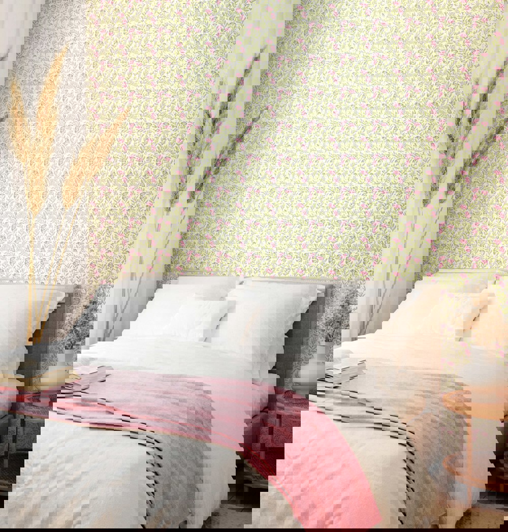 Petite repeating petals and leaves dot around the wall to create a usable small-scale design. Simple, elegant and timeless this design is perfect for adding charm to any space.