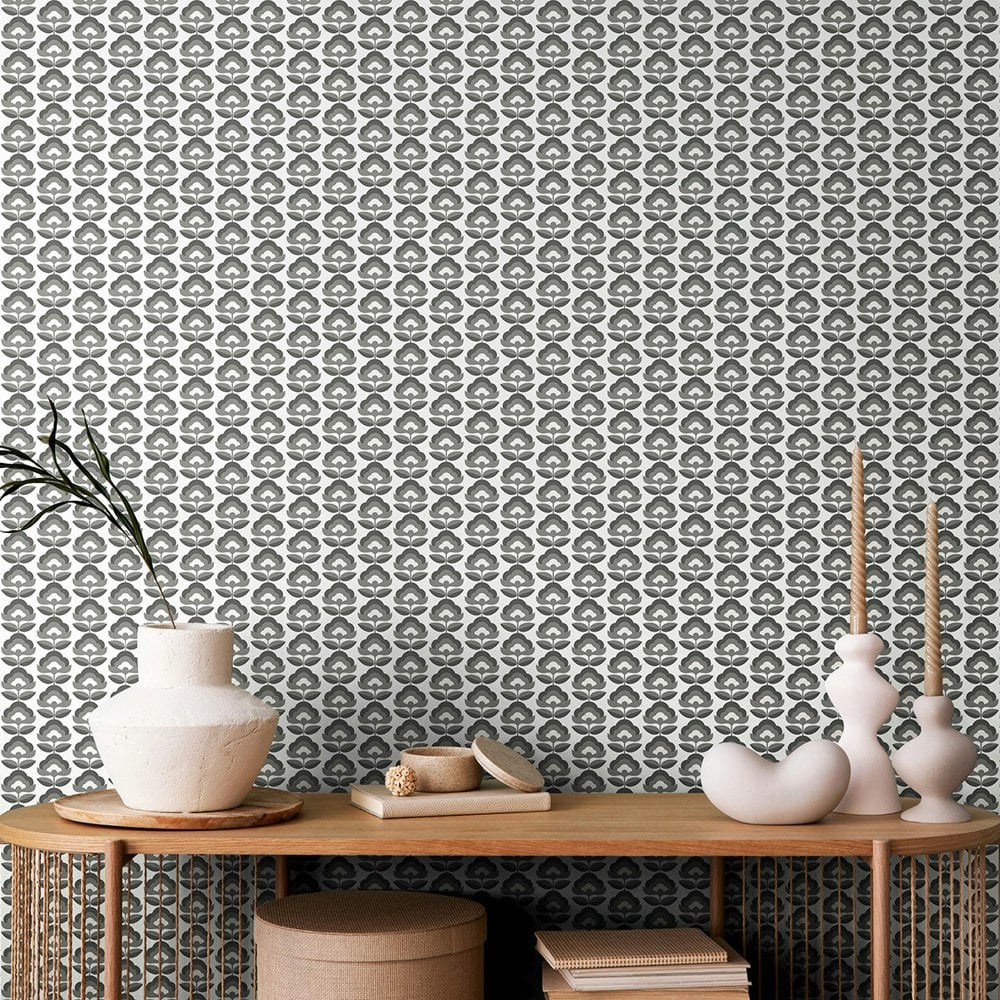 Hoopla Walls Retro Flower - Charcoal 10m Wallpaper