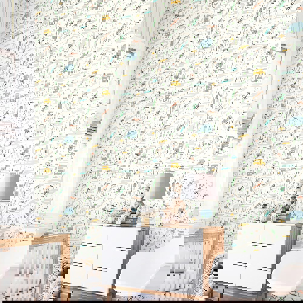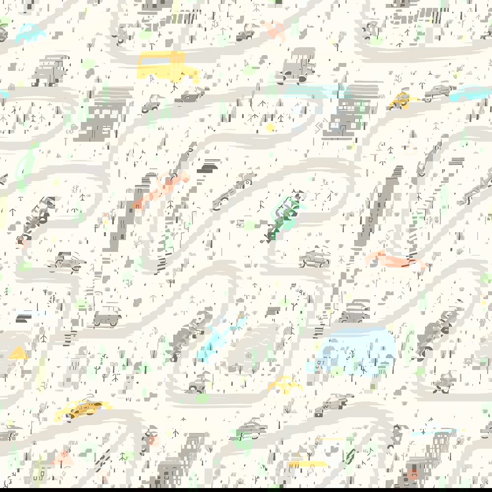 Buckle up—Road Trip is ready to roll! This lively wallpaper transforms any room into a fun-filled journey, complete with winding roads, cheerful cars, bouncy buses, and bold little jeeps cruising along the way. It’s perfect for little drivers with big imaginations—whether they’re planning their next destination or just enjoying the ride.