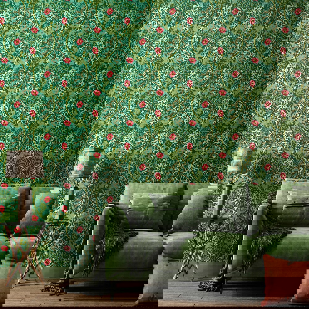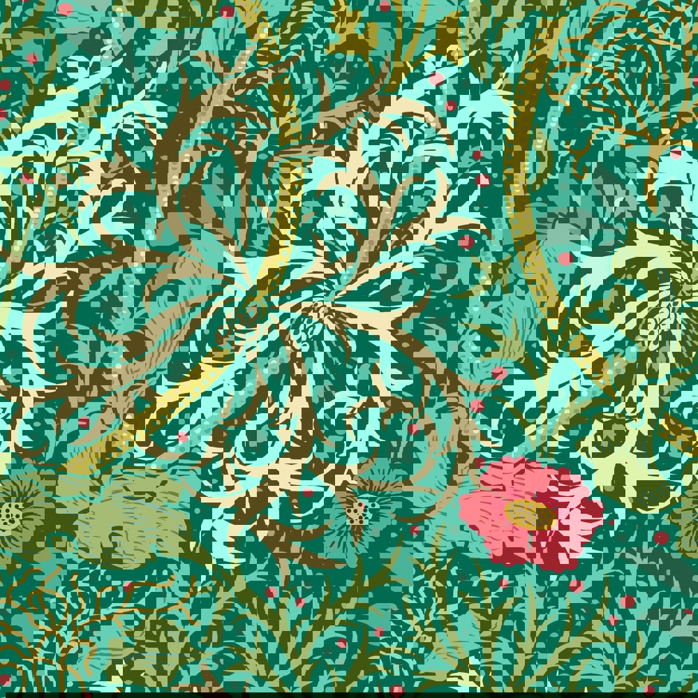 Submerged tangled plants entwine and criss-cross to create graceful movement and waves on the wall. A feast of foliage and seaweed heads, this illustrated design is a beautiful interpretation of John Dearle’s design for William Morris.