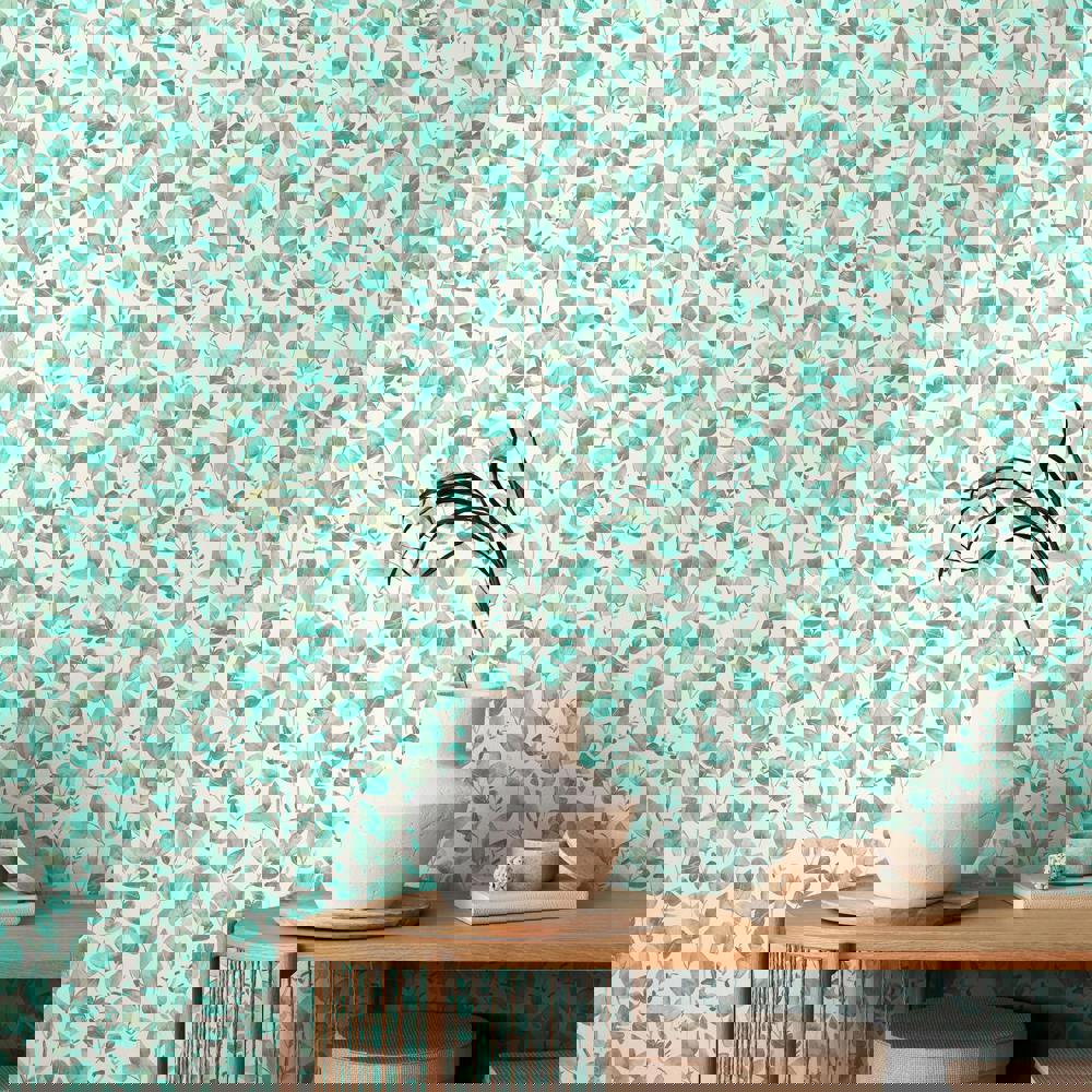 Hoopla Walls Watercolour Leaves - Aqua & Chalk 10m Wallpaper