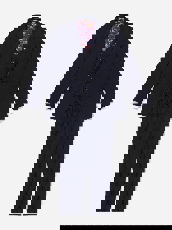 House of Cavani Seeba suit in navy from the Mini-me collection. This 3-piece set includes a blazer, waistcoat and trousers, finished with a subtle blue check and a rose gold lapel pin. The blazer and waistcoat include a floral lining, adding a distinctive detail for smart occasions.