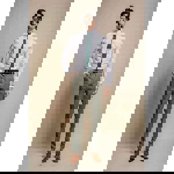 * For a cohesive and polished ensemble, these trousers can be effortlessly paired with the matching sage olive blazer and waistcoat, creating a well-coordinated three-piece outfit.