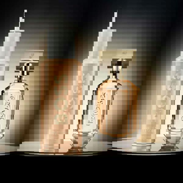 BOSS The Scent Eau de Parfum for Women reinvents empowering sensuality in a crystalline, refillable bottle featuring the BOSS logo on translucent glass and a BOSS Double-B monogram icy-gold cap. Capturing the spotlight, its multi-faceted shape reflects the sensorial showdown within this peachy-coloured scent, while echoing the many sides of a power couple.