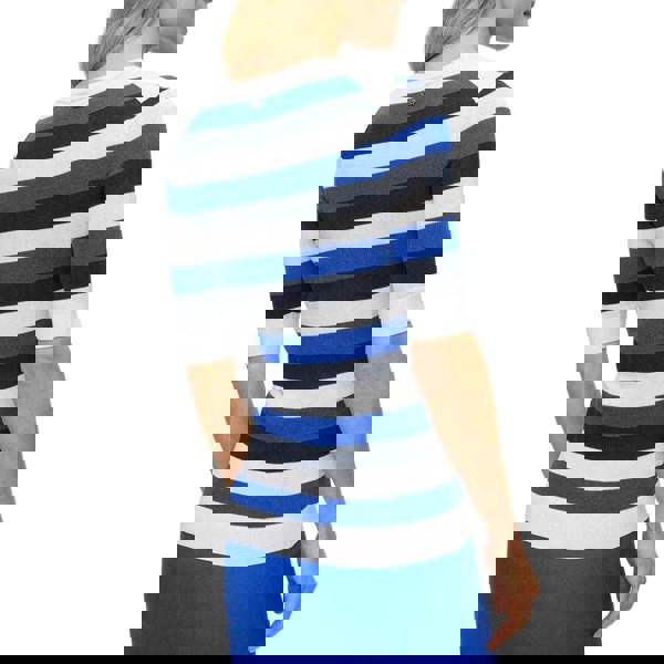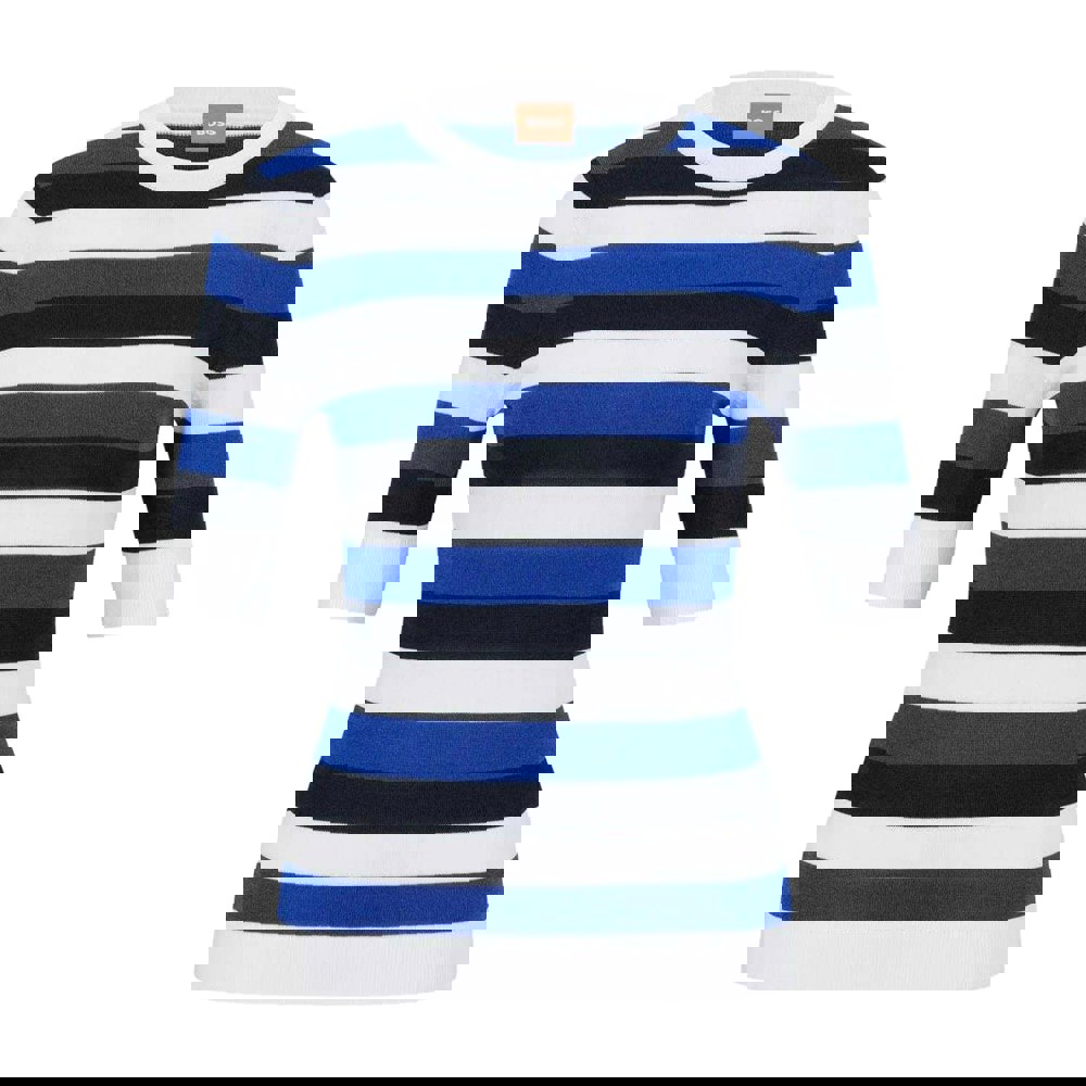 This Hugo Boss Facuba stripe top is made from viscose in a fine knit fabric. It has a striped design in blue, white and black, finished with a round neckline and half sleeves. Fitted cuffs and a fitted hem give the silhouette a clean, structured outline, making it suitable for everyday wear.