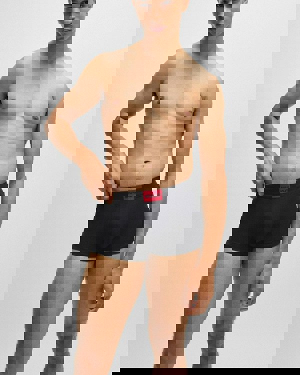 Three pairs of signature trunks in stretch jersey by HUGO Menswear. Each regular-rise pair has a HUGO logo patch on the waistband.
