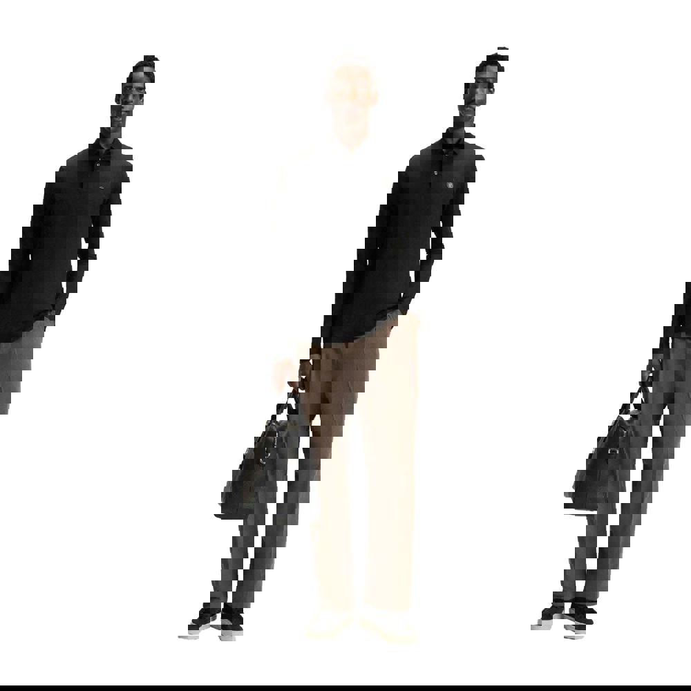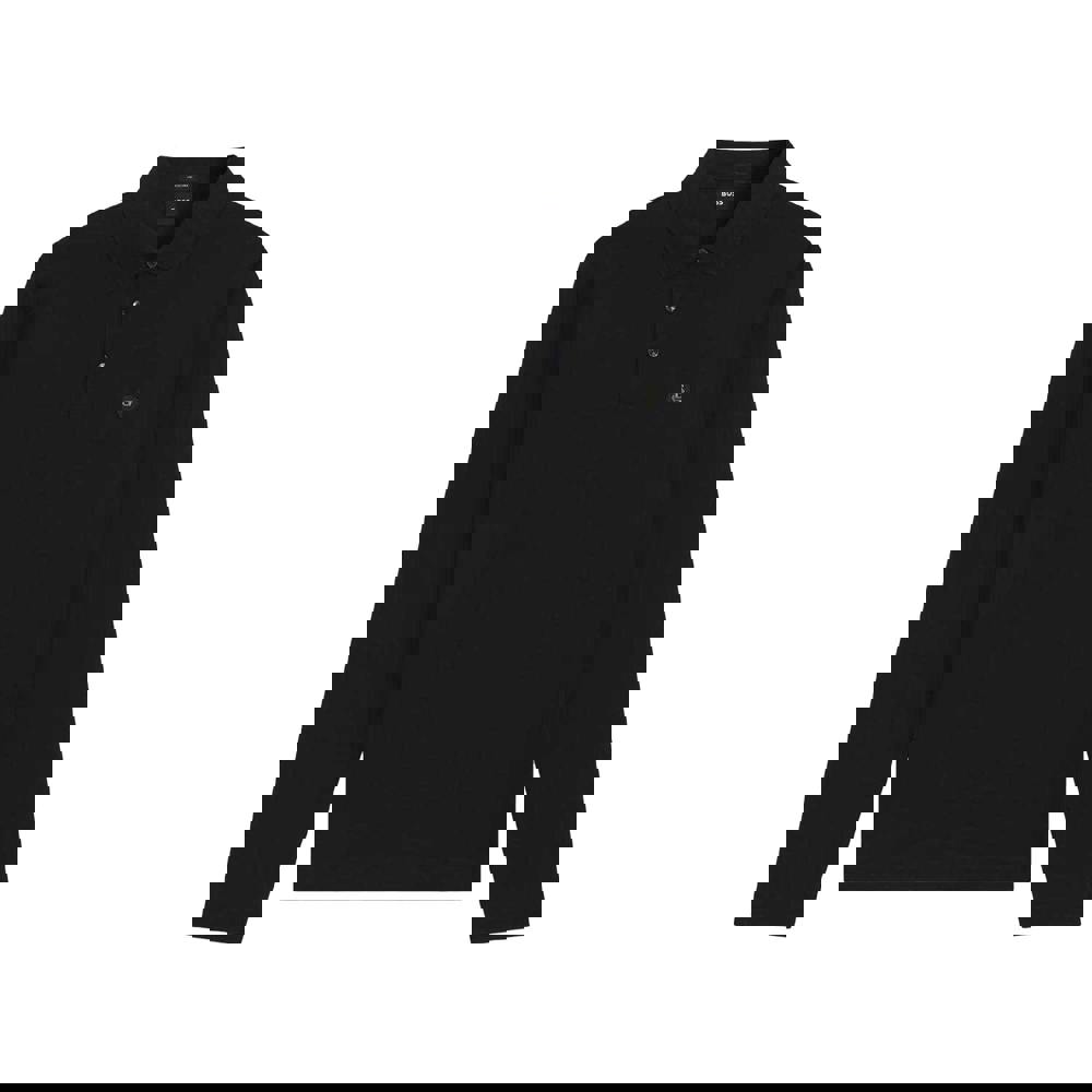 This long-sleeved polo shirt is made from 100% cotton with a soft-touch interlock fabric. It comes in black with a plain finish, detailed with a metallic monogram logo. A flat knit, turn-down collar and a three-button placket keep the look classic and clean, making it suitable for everyday wear.