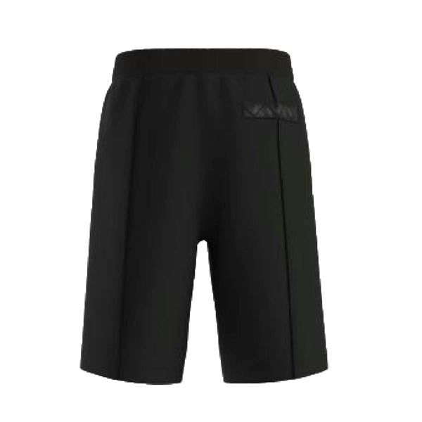 The design combines a plain finish with logo detailing and pintuck lines. An elasticated waistband with a drawstring allows for adjustable wear, while the pocket layout includes two side pockets and a single back pocket.