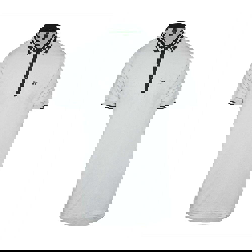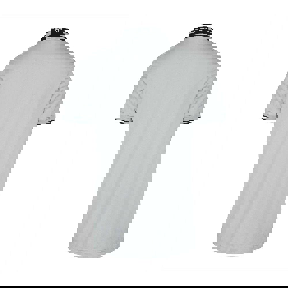 This polo shirt is made from 100% cotton interlock fabric and comes in grey with a striped design and logo detail. It has a turn-down collar with a flat knit finish, paired with a contrast-tipped edge for a clean, defined look.