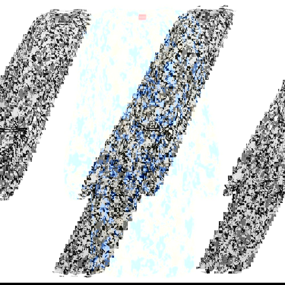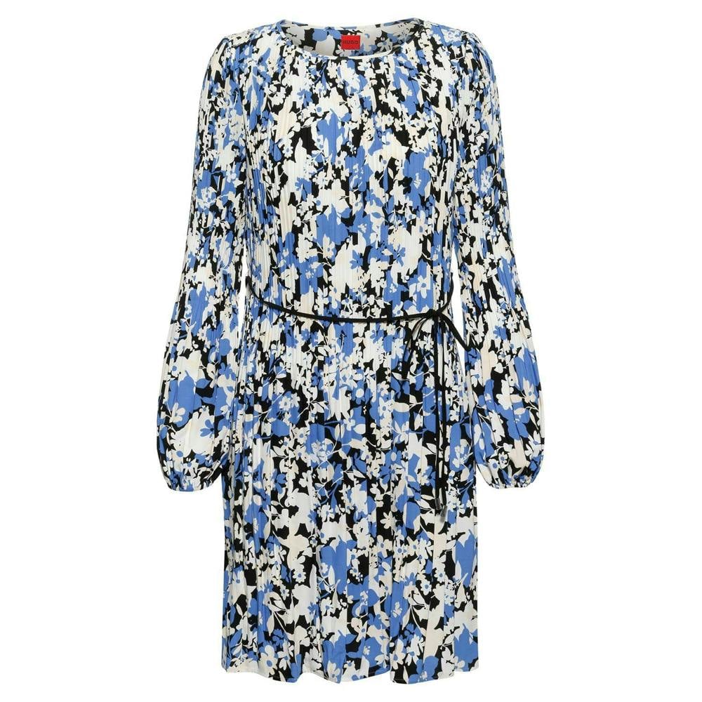 This Hugo dress comes in blue with a floral design and an all-over pleated finish. It has a crew neckline and long sleeves for a clean, covered silhouette, finished with a tie belt fastening at the waist.