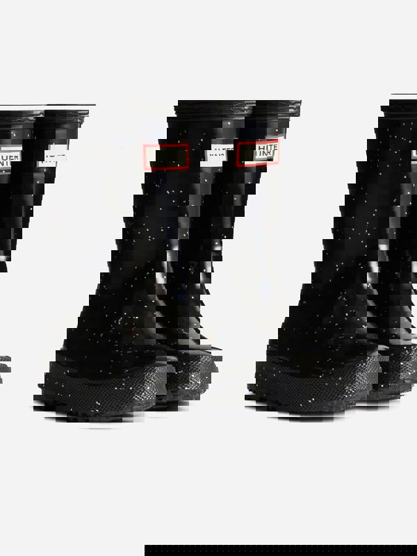 Hunter Kids First Giant Glitter Wellington Boots bring a bold update to a classic style, drawing on vintage archive influences with an updated finish. This unisex pair comes in black with a giant glitter look and a rounded toe. Made from natural rubber, they are fully waterproof for wet-weather wear.