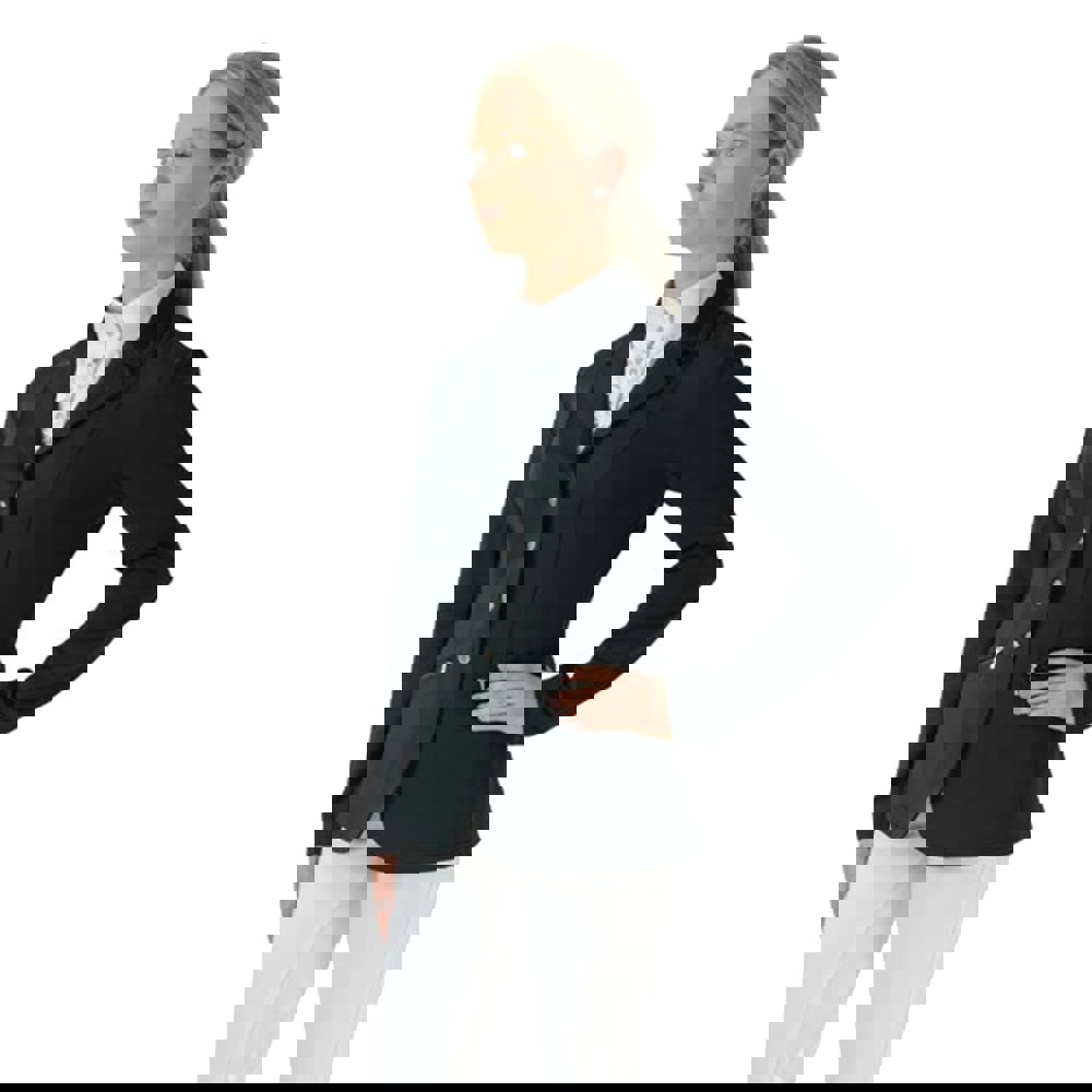 Finished with distinctive embellishment, the collar features black diamantes on the trim, complemented by contrasting mesh detail. The jacket fastens with four silver and black diamante buttons and is completed with twin slits at the back for a classic show-jacket silhouette. Two front zipped pockets provide secure storage, finished with silver YKK zips.