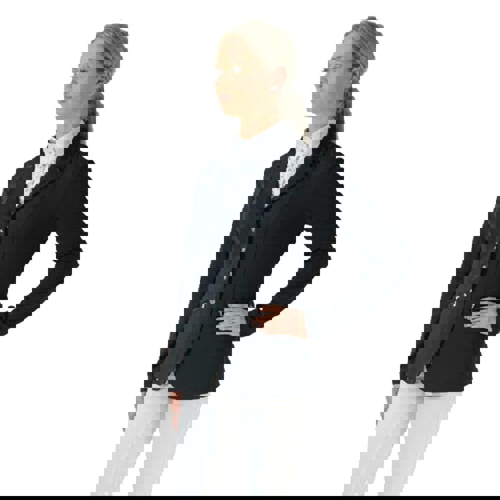 The HyFASHION Womens Invictus Pro Show Jacket in black is designed with technical Flex-tech material and a mesh overlay to help increase airflow. Quick drying for added practicality, it is well suited to busy show days when you want a smart finish with functional detailing.