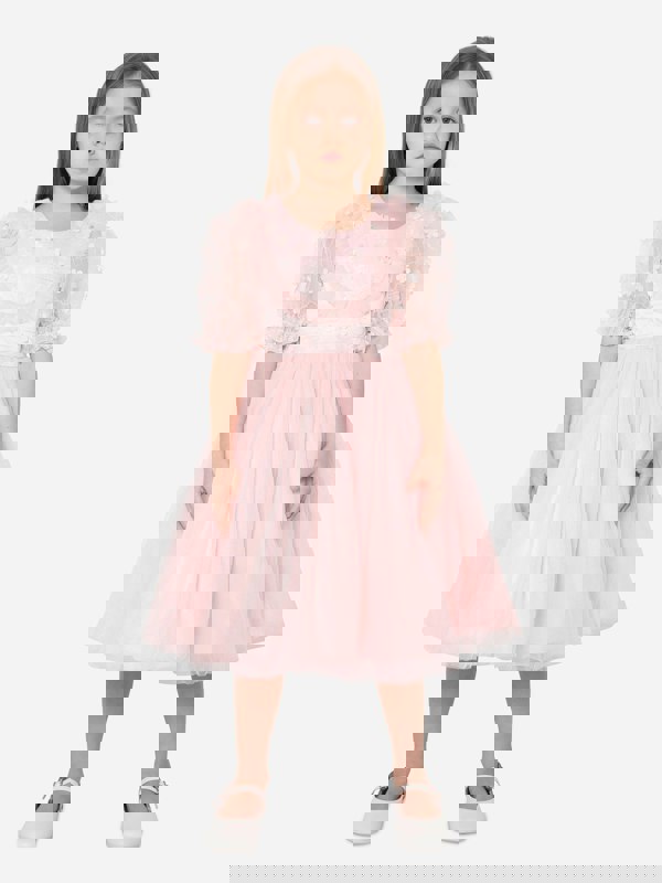 This girls’ dress from iAMe comes in pink with short sleeves and embroidered detailing. The embroidery adds a decorative finish, making it a distinctive option for a variety of occasions.