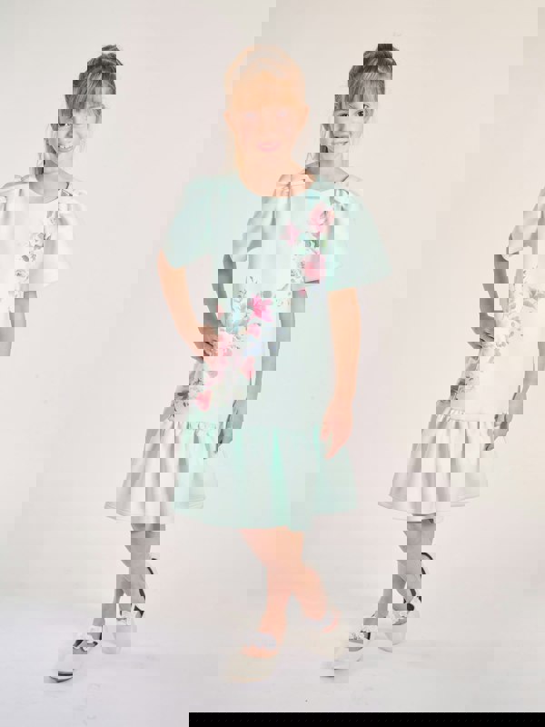 This girls Spring Breeze dress from iAMe brings a refined look to occasion wear. Made from a polyester and elastane blend, it comes in a sage green tone with a delicate floral pattern. Short puffy sleeves and a flared skirt create a softly structured silhouette, while the round neck keeps the finish clean and classic.