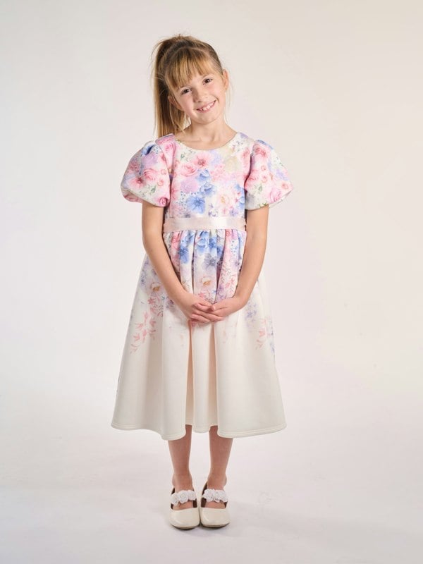 Puffed sleeves and a flared skirt create a defined silhouette, while a tulle underlay adds structure beneath. A detachable pink satin belt completes the look, and a back zip fastening keeps the finish neat and secure.