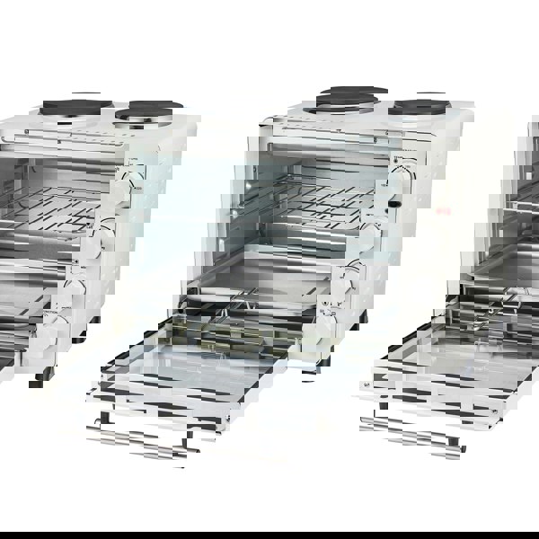 This IG7130 30 Litre Mini Oven and Grill with Double Hotplates combines a compact design with functionality and will be the perfect addition to any style of kitchen. Even with its compact nature, this Mini Oven with Grill and Double Hotplate packs a punch. Its got everything you need for cooking whilst taking up very little space, meaning its suitable for households, student accommodation or even for an office kitchen where space is a premium. The easy-to-use dials also make it very easy to get to grips with this unit's operation, so you can get cooking straight away. (PLEASE NOTE ONLY ONE HOT PLATE CAN USED AT A TIME)