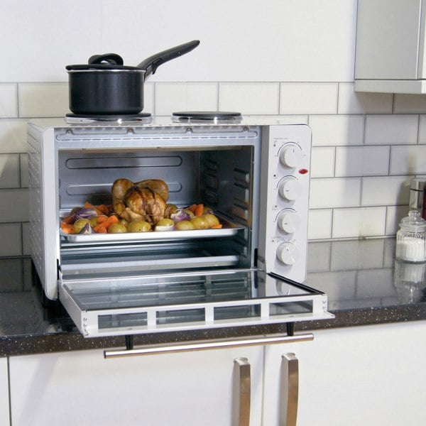 In addition, the oven has two hot plates with three temperature settings each, allowing you to heat sauces, stews, and other dishes efficiently