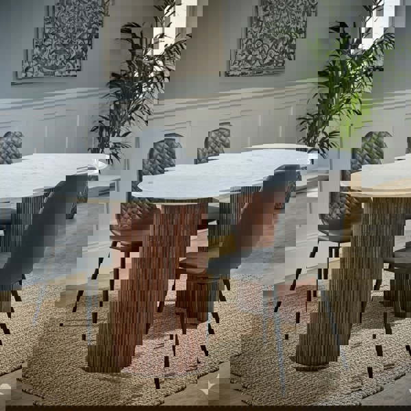 With a perfect balance of pattern and texture the Corona Chair is a statement piece ready for the modern dining space. The black legs add a sleek, minimalist finish and offer a perfect way to add a stark accent to your home. The Scandi-style faux leather seat with diamond pattern stitching is a unique take on a classic design offering comfort and durability for everyday use.