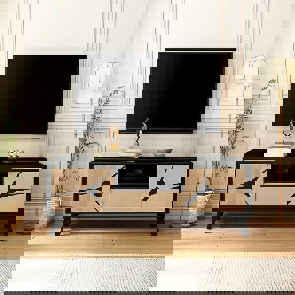 The sleek black finish of the frame complements the natural wood, while the robust black wooden legs add a touch of modern, industrial chic. With ample storage space for media players, game consoles, and accessories, this TV cabinet is as functional as it is stylish. Its low-profile design is perfect for housing your television upto 60 inches, and with only the legs requiring assembly, you can set it up in no time.