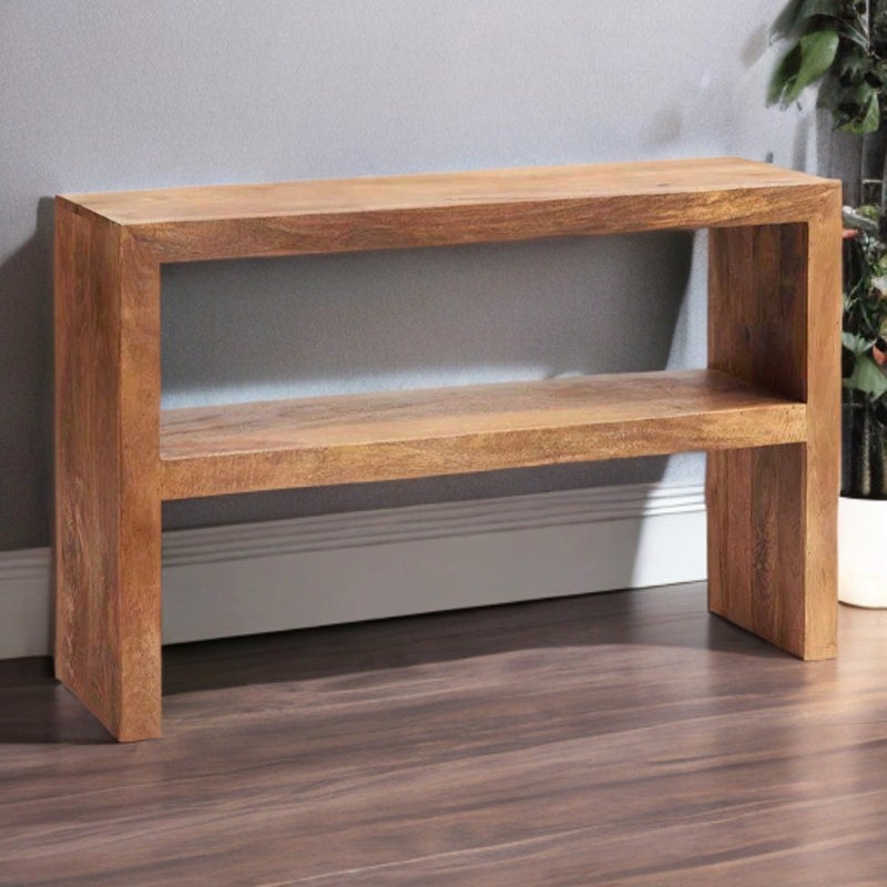 This console table features a handmade solid 100% light mango wood frame that boasts a unique and natural wood grain. This appealing wood grain is protected and enhanced by a light stain accompanied with matt finish that helps this piece to warm your room whilst maximising it with light reflecting qualities. This table also flaunts a lower shelf alongside a spacious table top for plenty of display space and will blend in beautifully with any existing decor you already have. Handmade by skilled craftsmen in India from Eco-Friendly Wood the item comes fully assembled for immediate use.