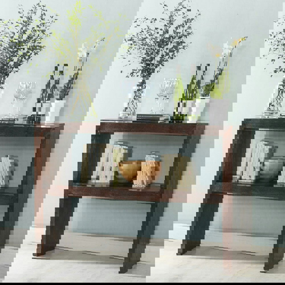 This console table features a handmade solid 100% grade A mango wood frame that boasts a unique and natural wood grain. This appealing wood grain is protected and enhanced by a dark walnut colour that helps this piece to give warmth to your room. This beautiful item also flaunts a lower shelf alongside a spacious table top for plenty of display space and will blend in beautifully with any existing decor you already have. Handmade by skilled craftsmen in India from Eco-Friendly Wood the item comes fully assembled for immediate use.