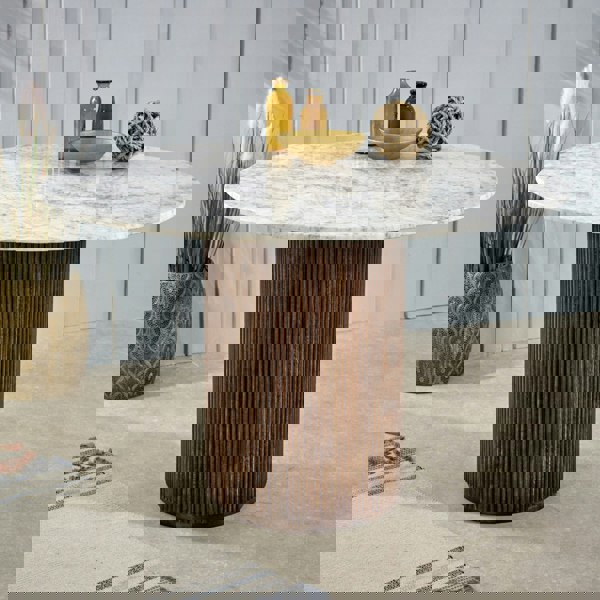 The functionality of this dining table is versatile, making it a great addition to any home. The marble top provides a sturdy surface for dining or working, while the mango wood legs provide a solid foundation. The round shape of the table encourages conversation and allows for easy interaction with all guests. The durability of this dining table is also top-notch. The handmade craftsmanship ensures that the table is built to last and can withstand daily use. The lacquered finish helps to protect the wood from wear and tear, ensuring that the table stays looking beautiful for years to come. Overall, the Miel Mango Wood Dining Table Round is a stunning piece of furniture that will be enjoyed by anyone who loves beautiful and functional home decor. With its sleek and modern design, versatile functionality, and top-notch durability, it is sure to be a standout piece in any home.