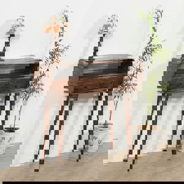 The console table features a sleek and modern design with a lacquered finish that adds a touch of elegance to any room. It has two spacious drawers that open smoothly and provide easy access to your belongings. The drawers are equipped with sturdy metal handles that complement the overall design of the console table. Whether you're looking for a functional piece of furniture for your hallway, living room, or bedroom, the Handmade Winnie Dark Mango Wood Console Table with 2 Drawers is the perfect choice. Its high-quality materials, unique design, and durable construction ensure that you're getting a piece of furniture that is both beautiful and practical.