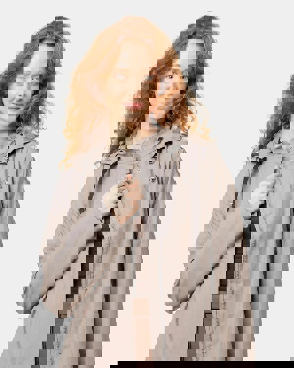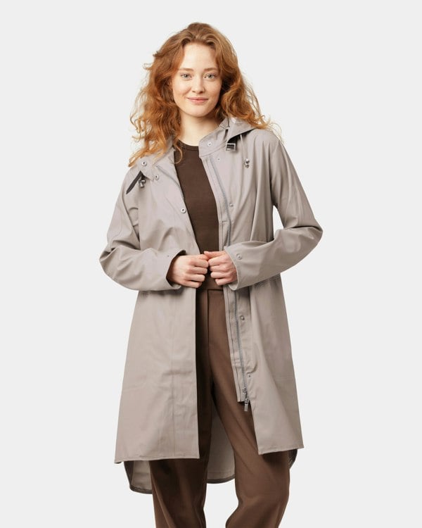 This iconic style is a feminine A-line raincoat made in a light and subtle waterproof rubberized PU fabric with a tricot backside. Features include welded seams, a detachable hood with artificial leather strap, side seam slits and storm front YKK 2-way zip closure. The raincoat has a discreet IJH logo debossed on left sleeve. A waterproof rating of 5000 mm will be enough for medium to heavy showers.