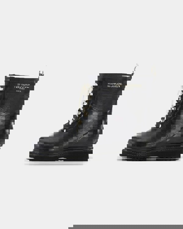 The iconic laced rubber boots. These ankle rain boots feature a decorative D-ring at center back and logo on the shaft. These wellingtons are made of natural rubber and have been cut by hand. The material can withstand temperatures down to -20° Celsius. The rubber composition is 80% natural rubber, 15% white fIllers and 5% other. If not treated regularly, natural rubber will develop a white surface over the years. This is simply because in time the rubber slowly lose its essential oil. In order to keep your boots in great condition for many years to come, we recommend that you treat them once a month with our oil.