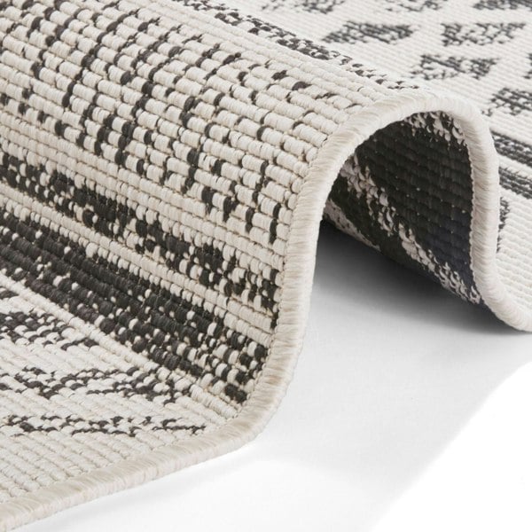 Bring modern style and practical functionality to your home with the Reversible Geometric Black Rug. Its slim flat-weave and bold pattern add contemporary flair, while the durable polypropylene construction makes it ideal for both indoor and outdoor areas.