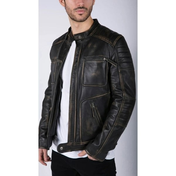• Mens Genuine Leather Biker Jacket In Stunning Black Brown Washed Leather