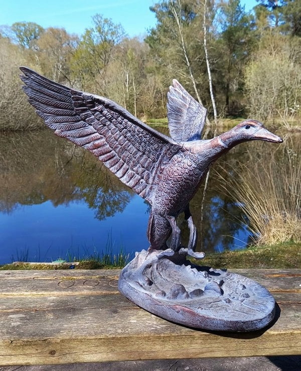Our unique cast aluminium garden ornaments are hand-made by skilled craftsmen using traditional methods. The hardiness of their construction enables outdoor display whatever the conditions. The Flying Duck is an impressive garden feature, the metal construction enables you to buy these statement pieces while keeping their weight manageable and prices low. The cast aluminium is durable and strong, withstanding all weather conditions.