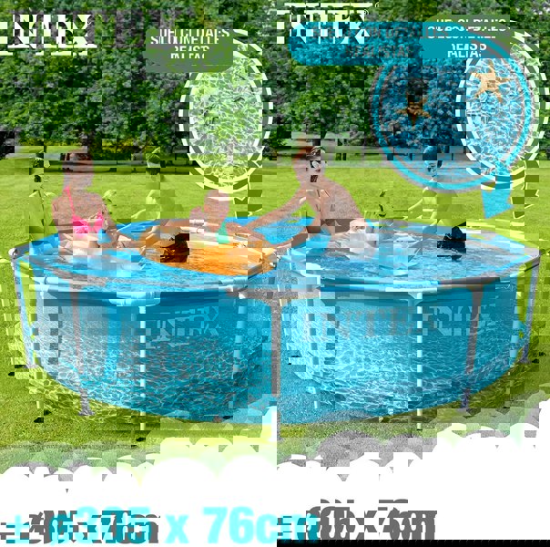 The pool has a round shape with a diameter of 3.05 meters, a depth of 76 centimeters, and can hold 4,485 liters of water. Big enough to swim in, yet compact enough not to take up too much space in the garden.