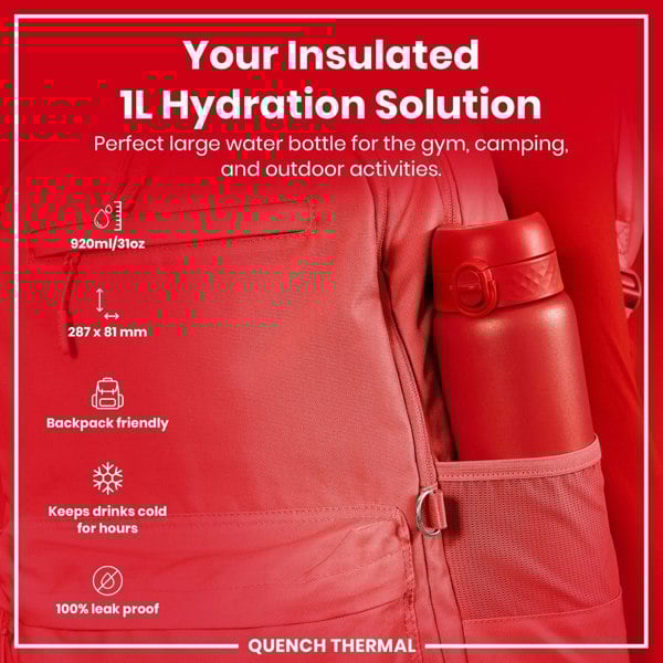 100% leak proof almost 1 litre (920ml / 30oz) vacuum insulated double wall stainless steel red water bottle with a smooth flow for spill-free hydration and hygienic full-flip top cover for one handed use on-the-go. Keeps hot drinks hot and cold drinks icy cold and fresh for hours.