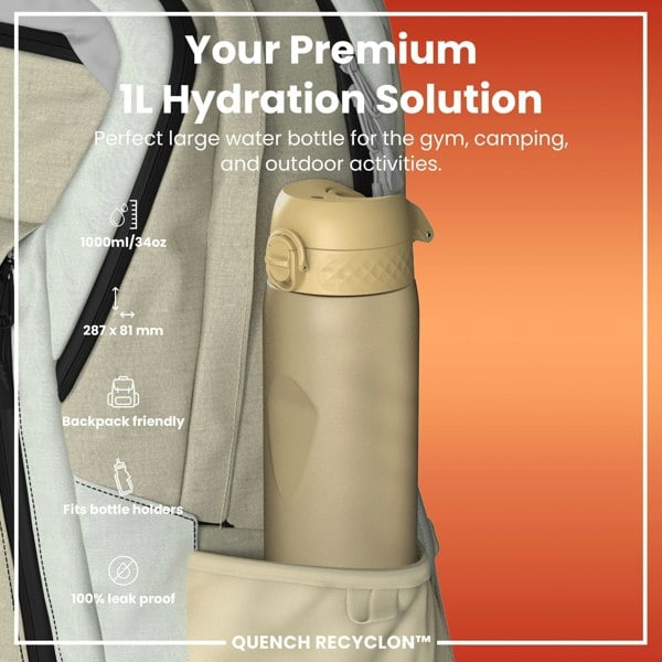 The perfect large water bottle for fitness, gym, camping and outdoors. This bottle has an integrated hand grip and fits wider or adjustable cup holders and external adult rucksack mesh pockets.