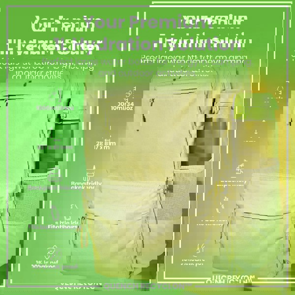 A light-green, 1000ml water bottle fits inside a tan backpack's side pocket; it's advertised as perfect for gym, camping, and outdoor use. The bottle is 287 x 81 mm, backpack-friendly, fits bottle holders, and is 100% leak-proof. QUENCH RECYCLON™ is also shown.