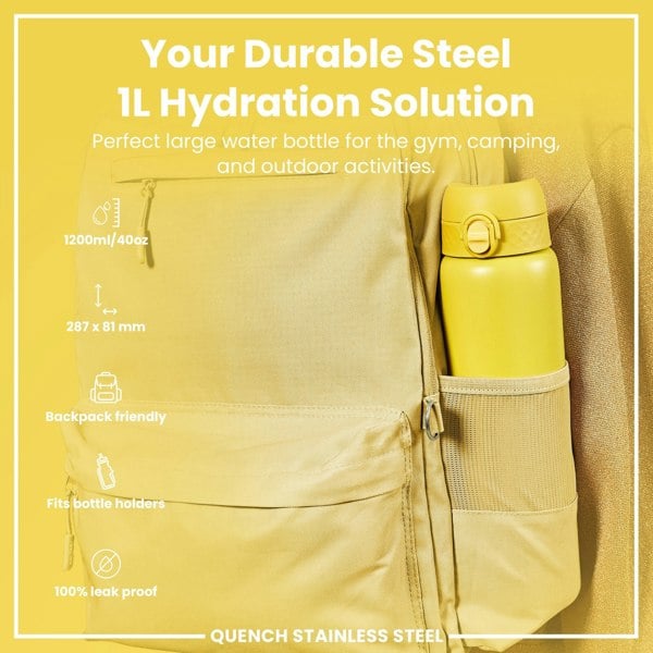 100% leak proof 1200ml / 40oz lightweight stainless steel yellow water bottle with a smooth flow for spill-free hydration and hygienic full-flip top cover for one handed use on-the-go.