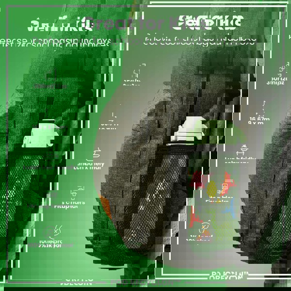 A green water bottle, fitting school bags and lunchboxes, is shown in a side pocket of a gray backpack. 350ml/12oz; 169 x 67 mm; Lunch box friendly; Fits cup holders; 100% leak proof. POD RECYCLON™.