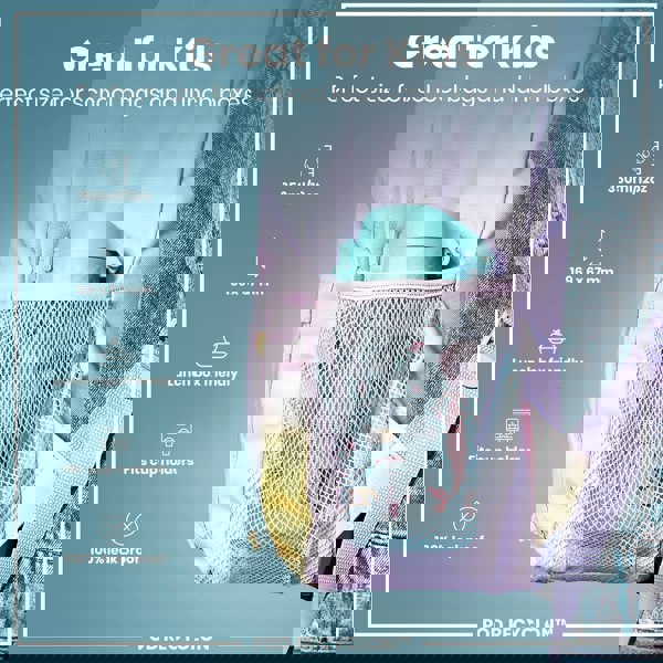 A teal water bottle fits inside a purple mesh pocket of a backpack; it’s lunchbox and cup-holder friendly, 100% leak-proof, and 350ml/12oz. Great for kids. POD RECYCLON™.
